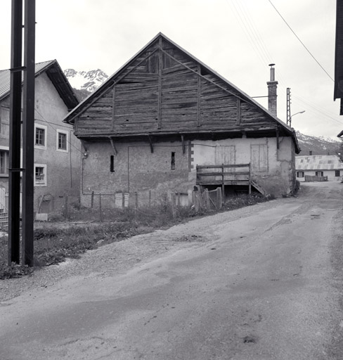 Ferme parcelle 2008. Façade est. Vue d'ensemble. La partie basse en maçonnerie date du XVIIIe siècle (cadran solaire daté 1785) mais la structure de la grange en "chapila" et en encorbellement a été édifiée en 1842 (poteau central : OP HR 1842).Immatriculation