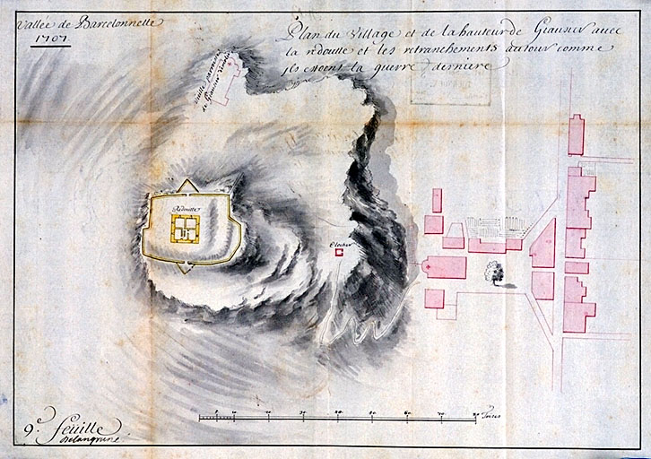 Plan du village et de la hauteur de Giauzier avec la redoutte et les retranchements autour comme ils estoent la guerre dernière. 1707Immatriculation