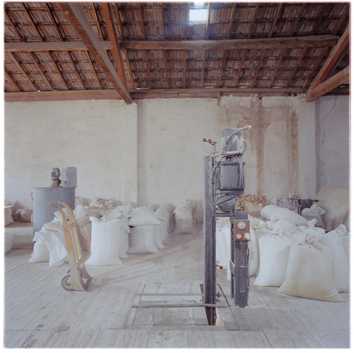 Deuxième étage : partie supérieure du monte-charge, chariot, trémie d'alimentation de la doseuse pondérale.Immatriculation