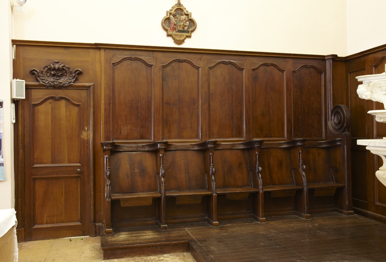 Vue des cinq stalles de gauche et de la porte de la sacristie.Immatriculation