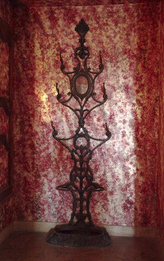 Rez-de-chaussée. Vestiaire-réception aux murs revêtus de papier métallisé provenant des Etats-Unis. Porte-chapeaux-porte-parapluies en fonte des années 1925.Immatriculation