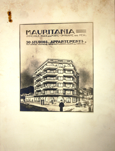 Mauritania. Immeuble place de la Poste - Ste Maxime sur Mer. 30 studios et appartements. [Dessin de la vue de volume représentée à partir de l'est. Document publicitaire. 1932.]Immatriculation
