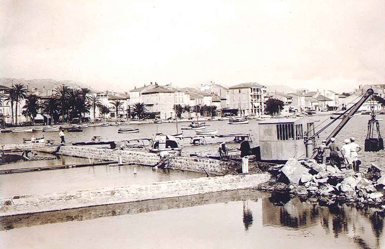 Port de Sanary, le quartier des pêcheurs, travaux d'élargissement du quai Wilson, vers 1952. /. Photographie noir et blanc. Archives communales, Sanary-sur-Mer. non coté.