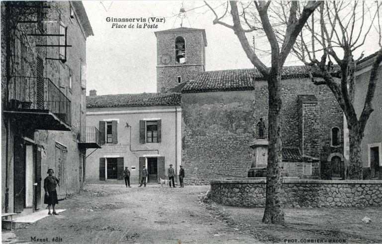 Ginasservis (Var) Place de la Poste. [Vue de l'élévation sud au début du 20e siècle.] / Carte postale, Combier éditeur à Mâcon, début 20e siècle. Collection particulière : non coté.