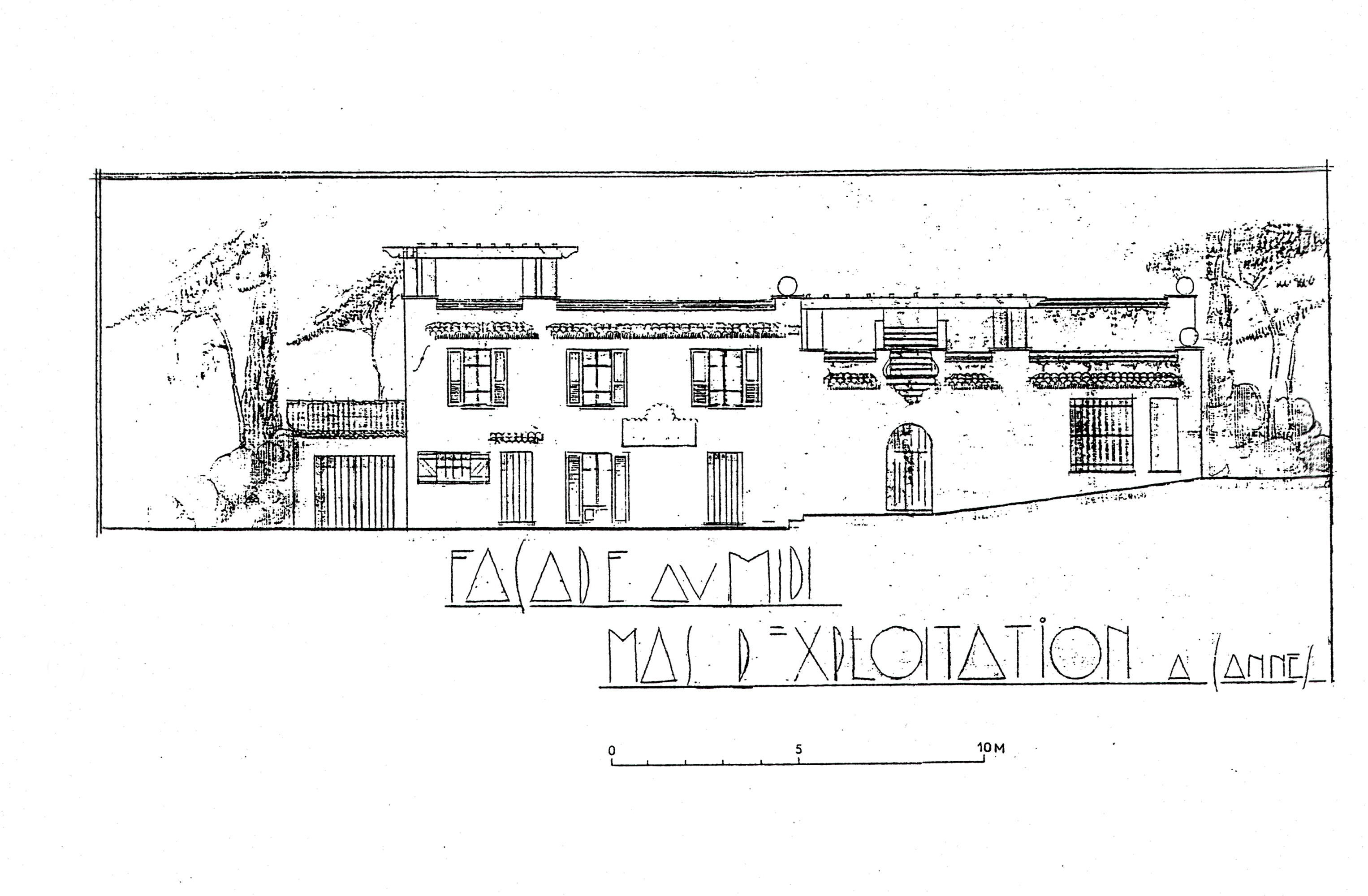 [Villa Mas provençal à Cannes.] Façade au midi. Mas d'exploitation à Cannes. / Dessin d'Henri Bret, 1936. Dessin d'Henri Bret, 1936. Archives communales, Cannes : P.C. 1936-35.