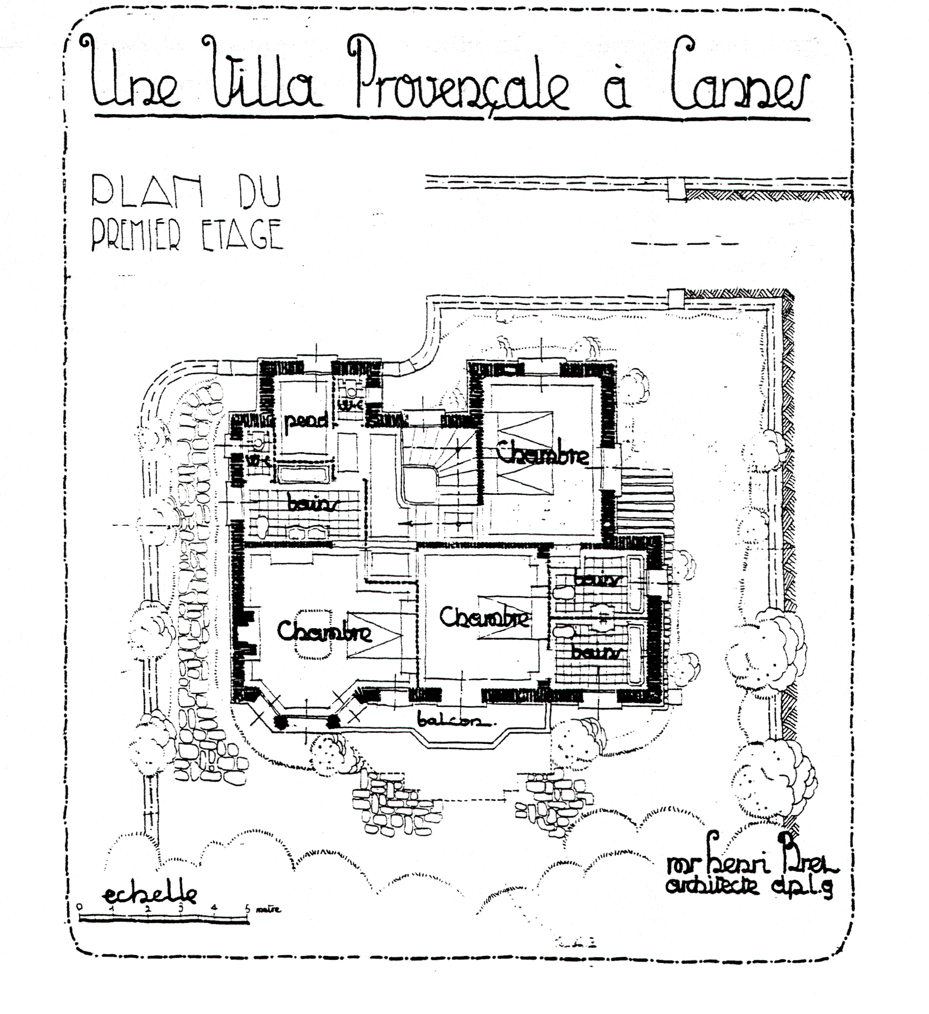 Une villa provençale à Cannes [villa Bagatelle]. Plan du 1er étage. / Dessin imprimé d'Henri Bret, [1931]. Dans : "Villa provençale à Cannes par Henri Bret, Architecte DPLG." / GOISSAUD, Antony, La Construction Moderne, 22 mars 1931, p. 393.