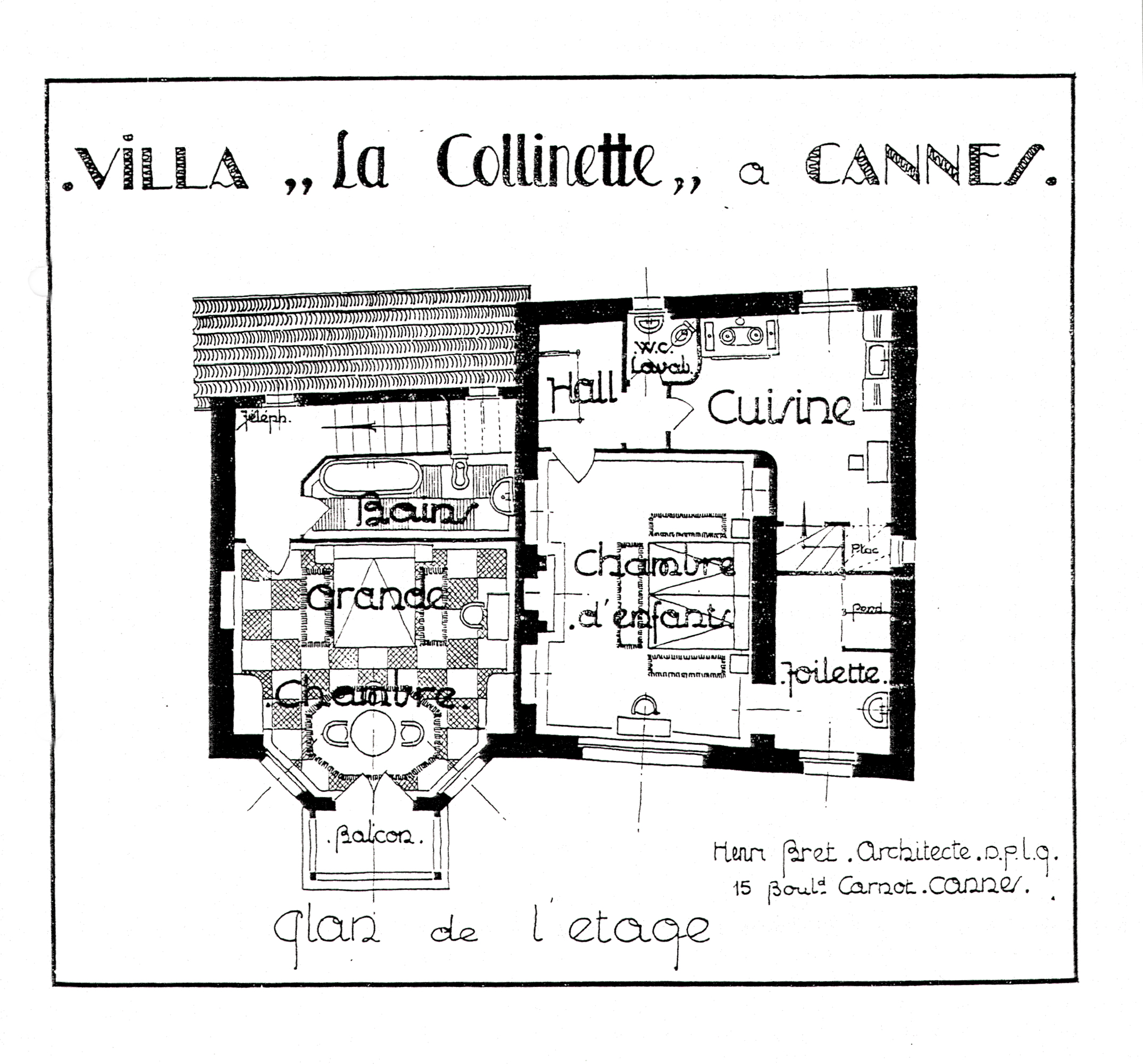 Villa La Collinette à Cannes. Plan de l'étage. / Dessin imprimé d'Henri Bret, 1929. Dans : "Villas à Cannes par M. Henri Bret" / ROTRU Jules, La Construction moderne, n° 20, 17 février 1929, p. 234.